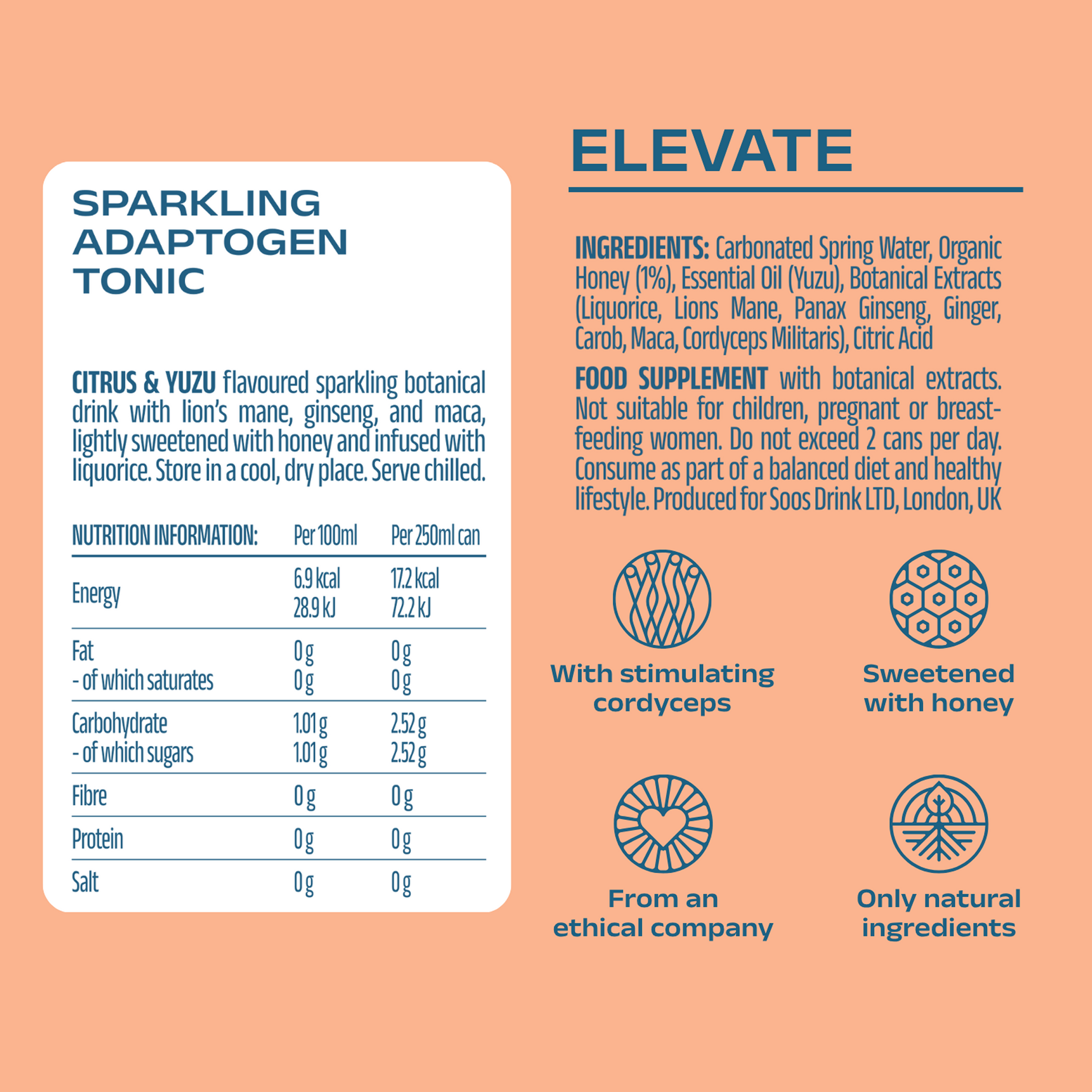 You’re in control. Because Elevate is alcohol-free and low in sugar, you can enjoy more than one without worry. The functional mushrooms are included at a balanced dose, so you’ll simply feel sustained clarity and energy with no hangovers or regrets.
